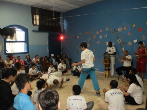 Na foto, um registro das crianças jogando capoeira durante o evento que recebeu apoio dos companheiros do RCSP Santo Amaro.