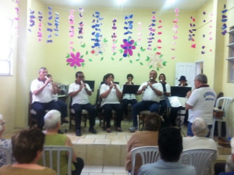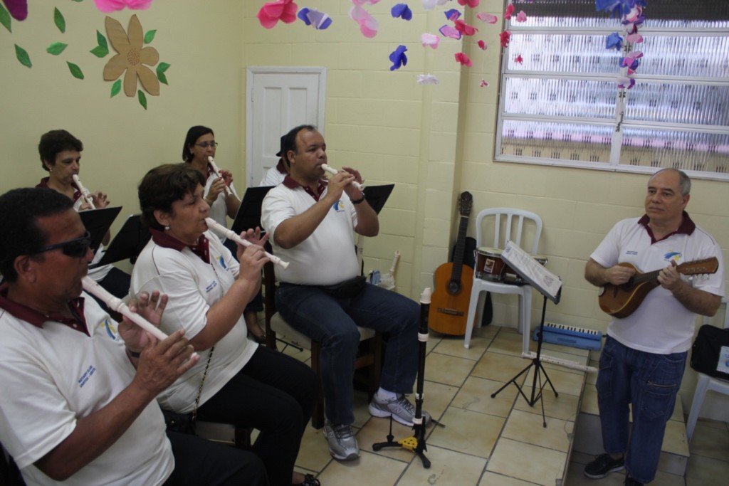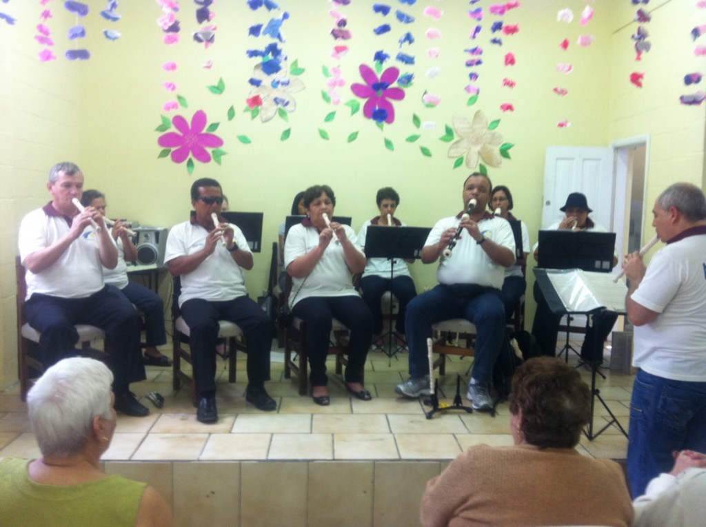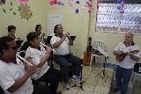 Na foto, um aspecto da apresentação dos integrantes do projeto Sopro Novo, nas dependências da Casa Dia Mãezinha Joana, em Santos-SP.